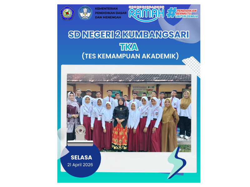 Sistem pendidikan Indonesia resmi memperkenalkan Tes Kompetensi Akademik (TKA) sebagai instrumen evaluasi standar nasional baru yang menggantikan UN. Pada Hari Senin dan Selasa tanggal 20-21 April 2026 SDN 2 KUMBANGSARI Melaksanakan Ujian TKA untuk kelas 6 pada tahun ajaran 2025-2026. Dengan tatanan Proktor Oleh Ibu Nur AZIZAH, S.Kom., Teknisi Oleh Bapak ANDI FIRMANSAH, S.Pd.SD., Gr. serta pengawas dari sekolah terdekat yaitu SD Negeri 1 Agel yakni Ibu SITI MASITA DEWI, S.Pd. yang mana TKA dirancang untuk mengukur kemampuan literasi dan numerasi siswa secara lebih mendalam, bukan sekadar hafalan. Kemudian TKA menjadi salah satu bahan pertimbangan seleksi ke jenjang pendidikan selanjutnya seperti Seleksi Nasional Berdasarkan Prestasi (SNBP) dan seleksi lainnya, serta menyetarakan hasil belajar jalur pendidikan formal dan nonformal. Semoga mendapat hasil yang memuaskan Anak-anak hebat 🦾